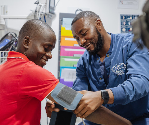 • Sahr, the first patient of the 2024-25 field service in Sierra Leone, with Divine Acha, Preoperative Nurse from Cameroon