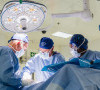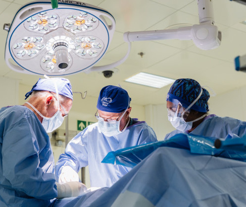 • Dr. Bill Brown and Dr. Timothy Burandt, General Surgeons, perform surgery on the first patient of the 2024-25 field service in Sierra Leone with the help of Daena Vaz Viegas, Operating Room Nurse