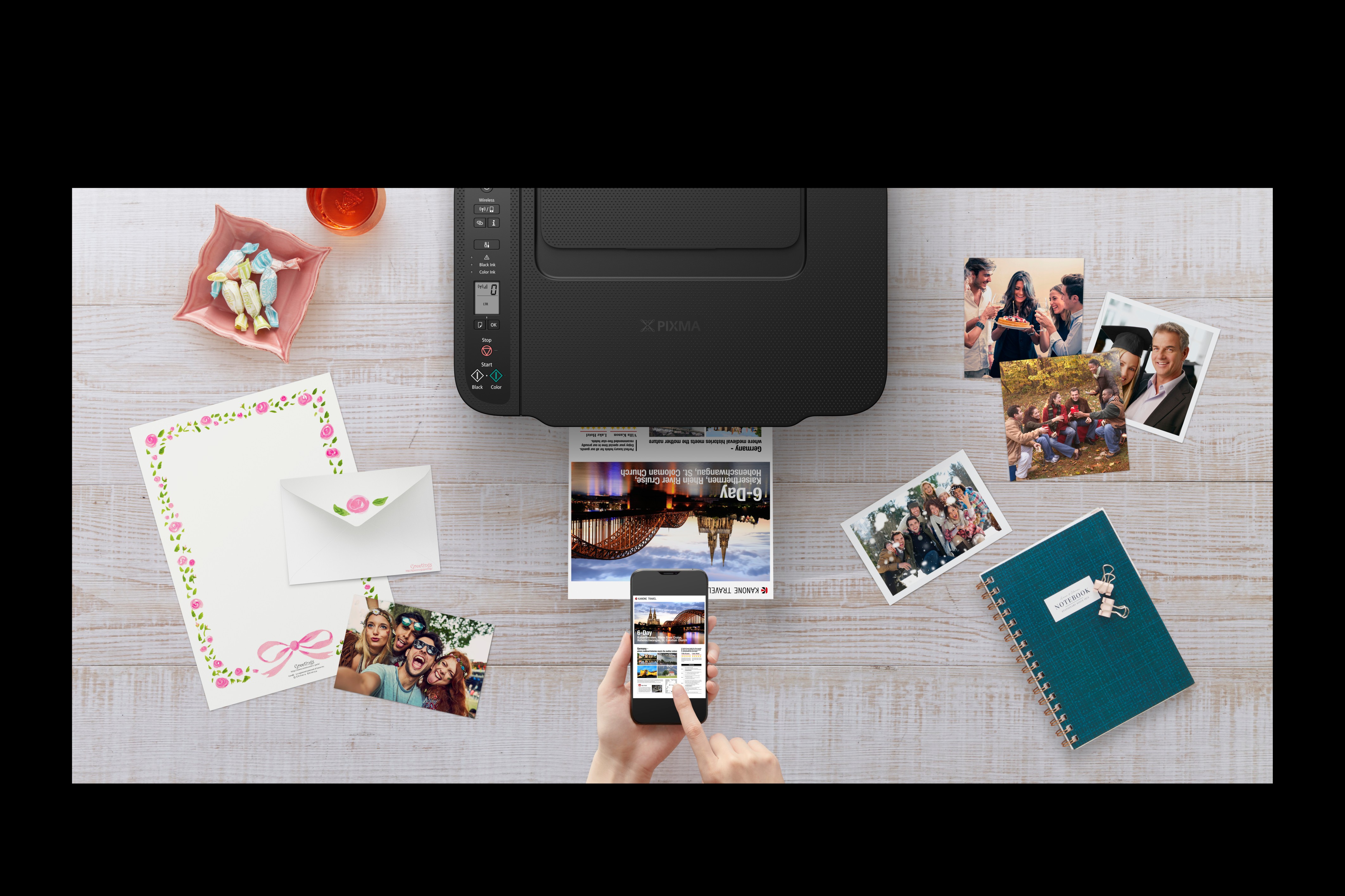 Supporting a diverse range of media, the PIXMA TS3440’s rear paper feed is compatible with a variety of paper types, including Canon’s Magnetic Photo paper and Restickable Photo paper, to make personalised fridge magnets or stickers that brighten up any home. With a smoother paper pass and clearer loading instructions, users are guaranteed perfect prints every time – ideal for printing photos for gallery walls with Canon’s 5x5” square media.