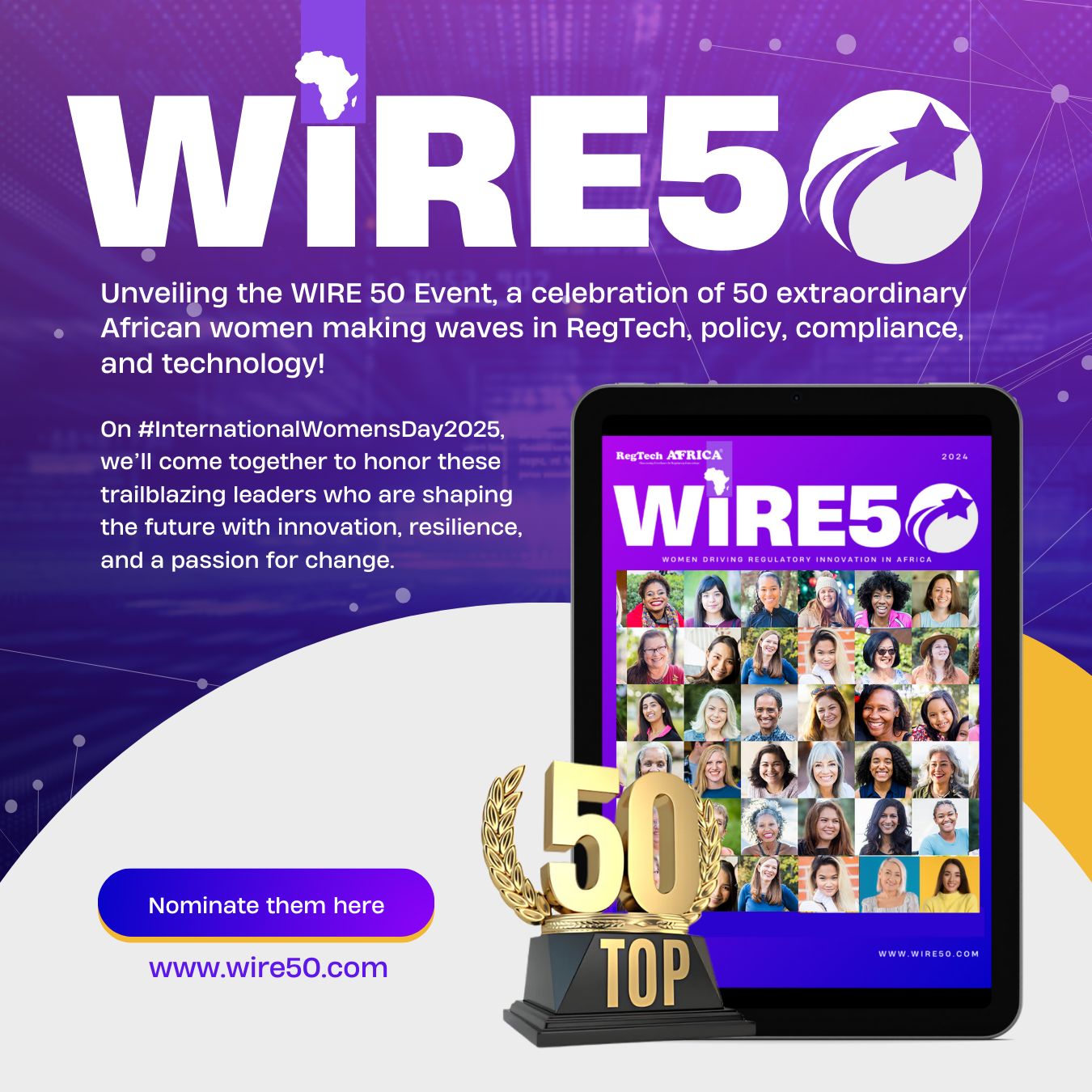 RegTech Africa (www.RegTechAfrica.org) is proud to announce the inaugural WIRE 50 Event, a prestigious celebration honouring 50 women driving innovation, leadership, and impact in the fields of regulatory technology (RegTech), compliance, policy, and related disciplines across Africa and beyond. This event will be part of the International Women’s Day (IWD) 2025 celebrations, reflecting the year's IWD theme: "Accelerate Action."