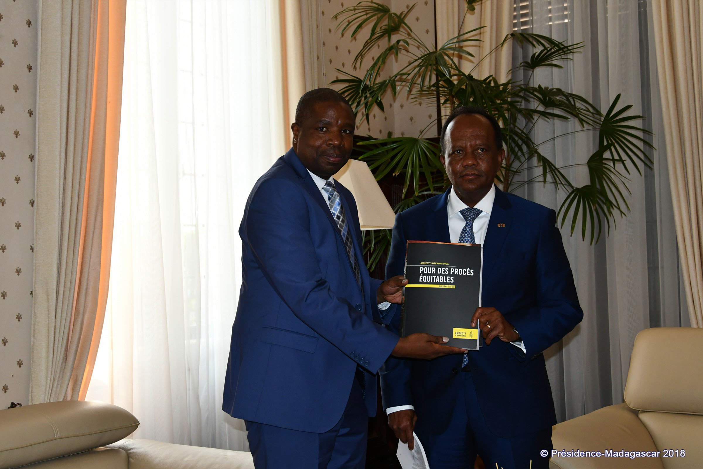 La délégation a remis au Président de la République a.i, deux documents, le premier intitulé « Punis parce qu'ils sont pauvres », issus de travaux et de recherches menés pendant une année, et, le second, le manuel pour des procès équitables. Le chef de la délégation d’Amnesty International a indiqué qu'il y a une crise de la détention préventive dans la plupart des établissements pénitentiaires, mais aussi des conditions de détention non-appropriées aux droits humains. Amnesty International a demandé aux autorités malgaches, à travers le Chef de l'État, de s'engager à améliorer les conditions carcérales. Pour sa part, le Président a.i Rivo Rakotovao a pris note du rapport et de ses recommandations, et a déclaré agir, avec toutes les parties concernées, sur le court et le long terme, pour améliorer la situation.