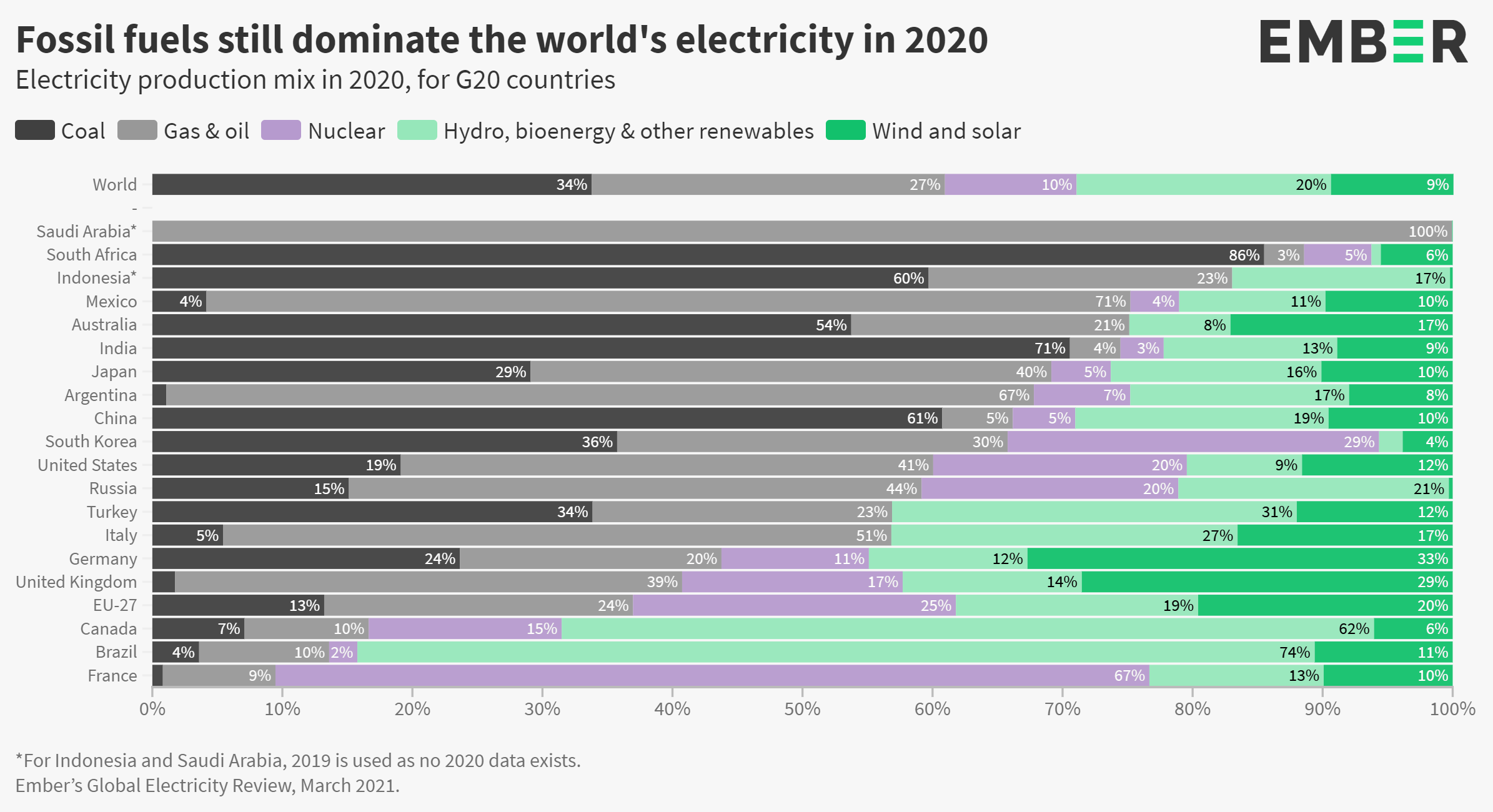 Across the G20 there were also many countries with fossil fuel shares above the global average in 2020. Five G20 countries had over three-quarters of their electricity supplied from fossil fuels in 2020: Saudi Arabia (100%), South Africa (89%), Indonesia (83%), Mexico (75%) and Australia (75%). In comparison, France and Brazil only generated 9% and 14% of their electricity from fossil fuels, respectively.