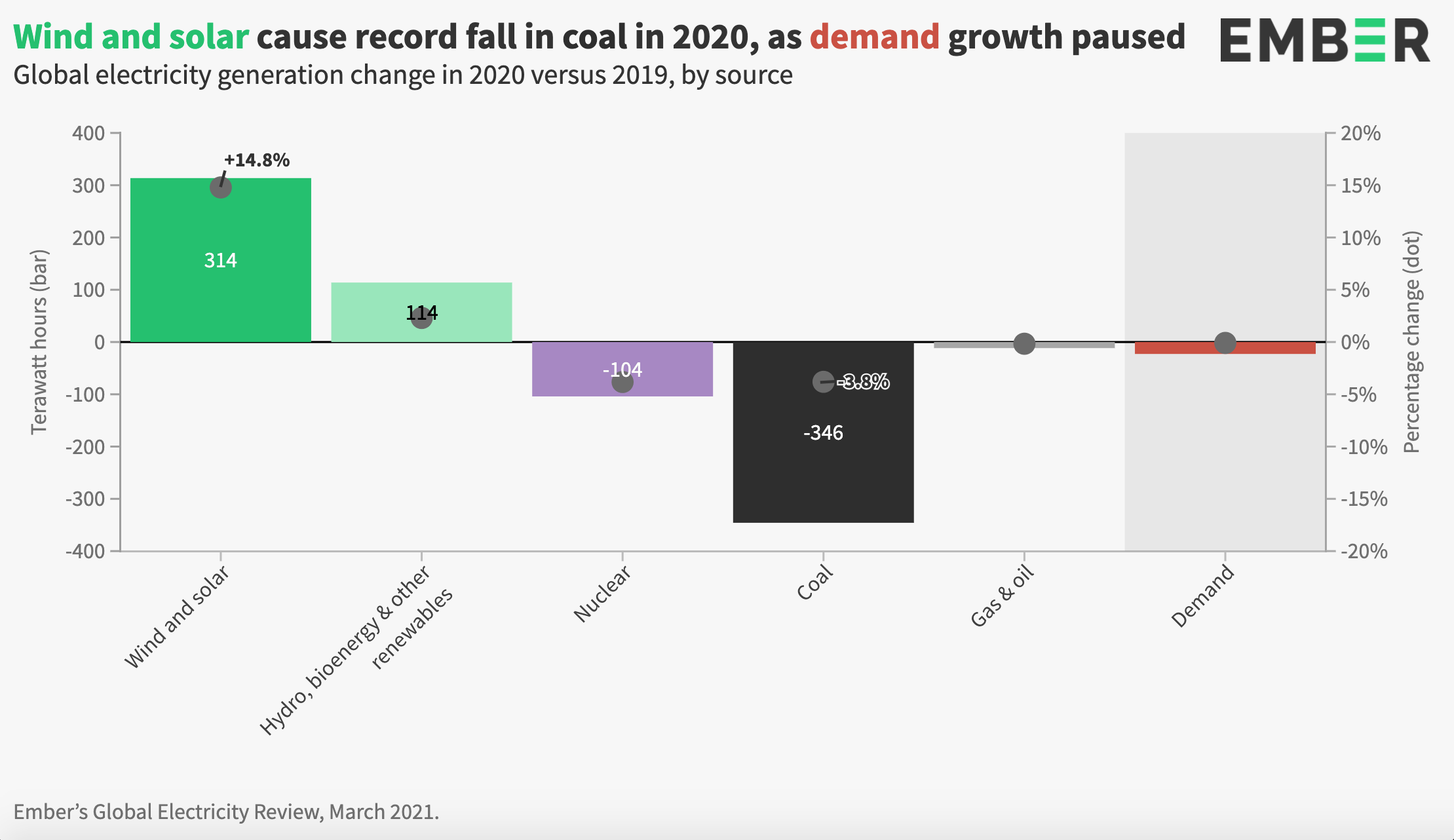 Wind and solar power showed resilient global growth in 2020 despite the pandemic, up by 15% (+314 TWh) versus 2019. The growth in wind and solar helped push coal power to a record fall of 4% (-346 TWh).