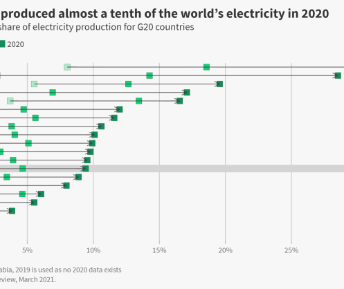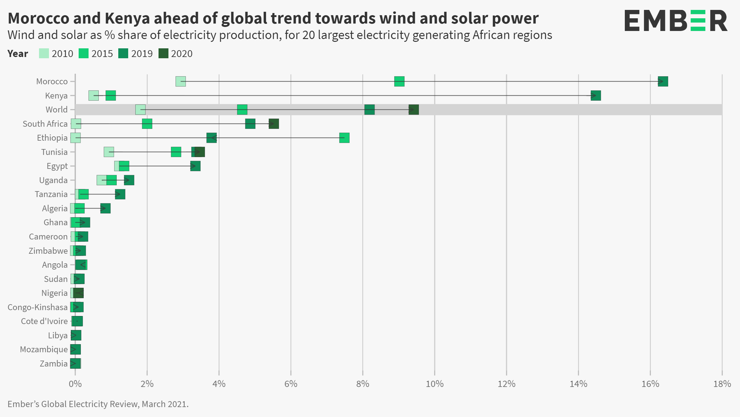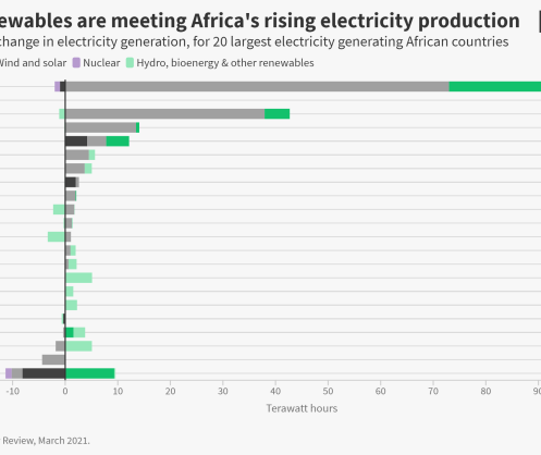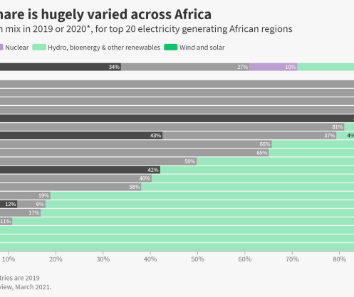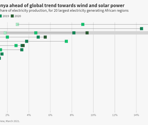 Globally wind and solar doubled in the last five years to supply almost a tenth of global electricity in 2020. Among Africa’s leading economies, Morocco and Kenya had the highest levels of wind and solar, respectively generating 16% and 15% of their electricity from wind and solar in 2019.
