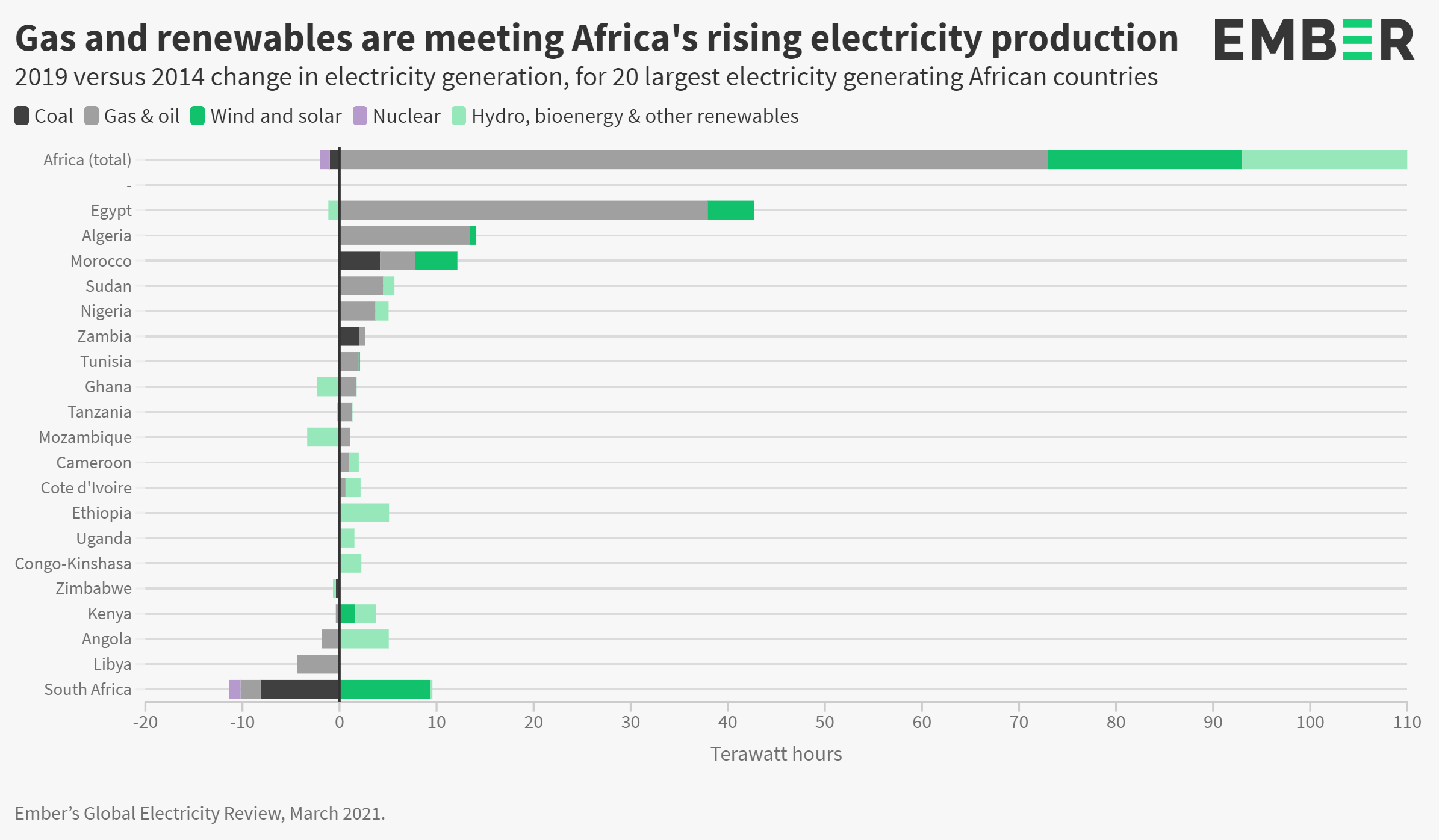 Many of Africa’s leading economies have yet to harness the potential of wind and solar power, which are now amongst the cheapest forms of new electricity. In 2019, Nigeria and Algeria generated less than 1% of their electricity from wind and solar, while Egypt increased to 3% in 2019 after recent growth in solar power. South Africa generated 6% of its electricity from wind and solar in 2020, tripling since 2015, but still below the world average of 9.4%.