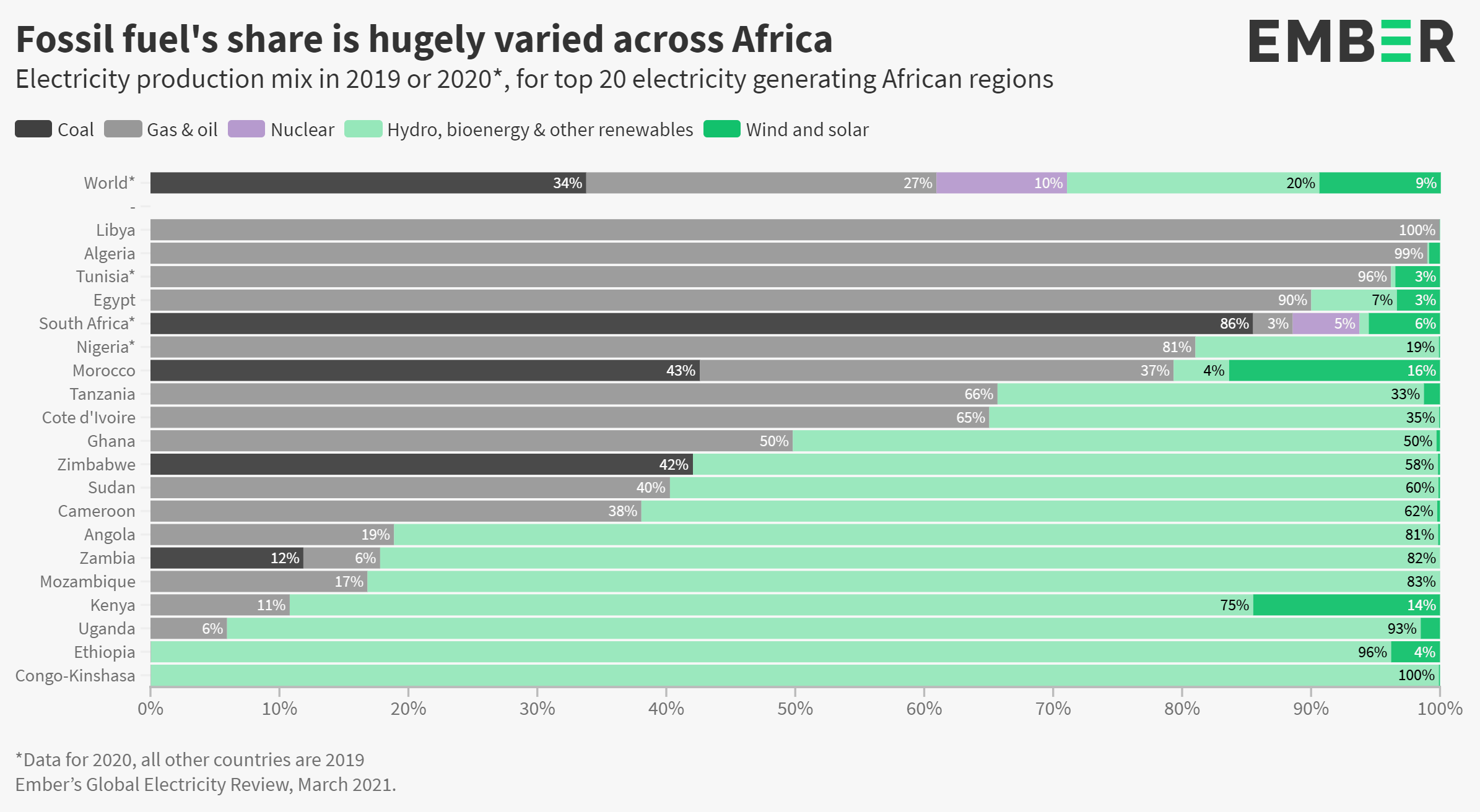 However, fossil fuel’s share of electricity is hugely varied across Africa, as many countries have far higher shares of clean electricity than the world average in 2020 (39%). Ethiopia, Kenya, Angola and Zambia all generated over 80% of their electricity from clean sources in 2019. Kenya recently pledged 100% renewable electricity by 2030 (https://bit.ly/3nLogGK), showing their commitment to a clean energy future.