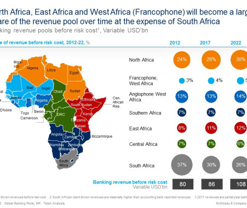 1. Draw the right map. In Africa, geography matters. About 65 percent of African banks’ profitability (measured by RoE) and 94 percent of their revenue growth are attributable to their geographic footprint. Importantly, the report highlights a shift in exchange-rate adjusted revenue pools North Africa, East Africa and West Africa, and away from South Africa.