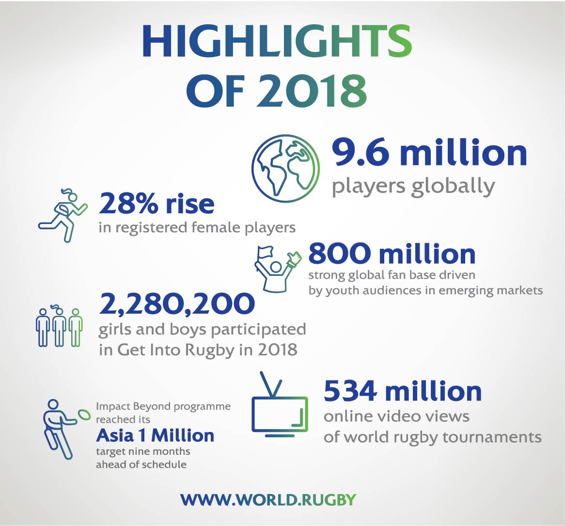 « 2018 a été une autre année spéciale pour le rugby au moment où le sport a continué à prospérer et à se développer sur et hors du terrain », a déclaré Sir Bill Beaumont, le président de World Rugby. « Sur une population totale de 9,6 millions de pratiquants, il était fantastique de voir notre programme Get Into Rugby - organisé en partenariat avec les fédérations et les régions - continuer à battre des records de participation avec plus de deux millions de filles et de garçons dans le monde entier qui s’impliquent pour la deuxième année consécutive au cœur d'une base croissante de fans de 800 millions de personnes dans le monde.