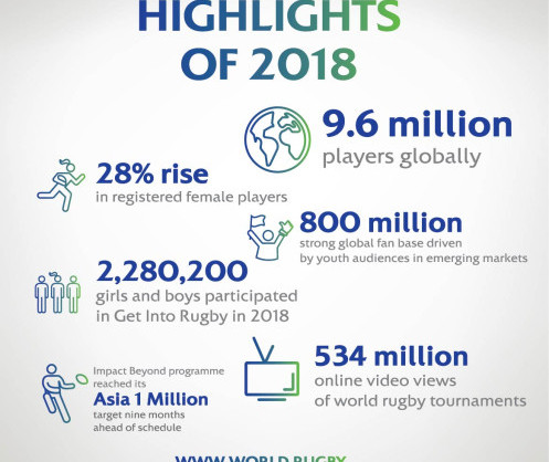 La croissance sans précédent de ce sport s'est poursuivie en 2018 avec près de 9,6 millions d'hommes, de femmes et d'enfants qui pratiquent aujourd'hui le rugby dans le monde entier. Cela comprend 2,7 millions de femmes, soit une hausse de 10% par rapport à l'année précédente, ce qui correspond à plus d'un quart de la population globale des joueurs. Rien qu'en Afrique, le nombre de joueurs licenciés a dépassé le million (1 004 674 exactement), soit une hausse de 26% par rapport à 2017 alors que le rugby continue de gagner des parts de marché sur le continent.