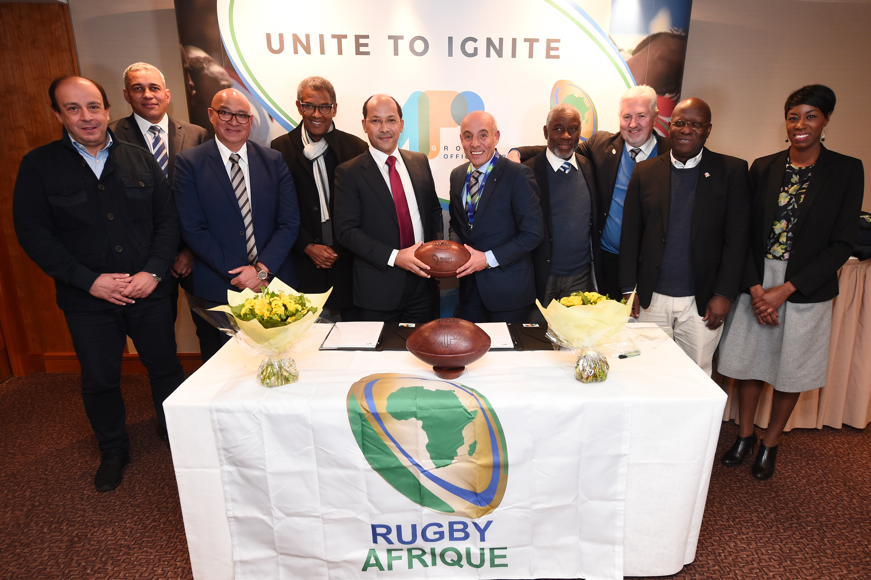 • (From Left to Right) - World Rugby’s African association, Rugby Africa’s executive committee surrounding APO Group’s Founder and CEO, Nicolas Pompigne-Mognard (left) and Rugby Africa’s Chairman, Abdelaziz Bougja (Right) during the signing ceremony of the agreement under which APO Group becomes the main Official Sponsor of Rugby Africa, at Royal Garden Hotel on November 12, 2017 in London, England. (Photo by Eamonn M. McCormack/Getty Images for APO Group)