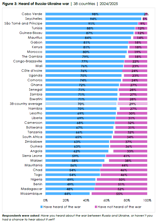 • Seven in 10 Africans (70%) say they have heard about the Russia-Ukraine war, ranging above nine out of 10 citizens in Cabo Verde (98%), Seychelles (94%), and São Tomé and Príncipe (91%) (Figure 3).