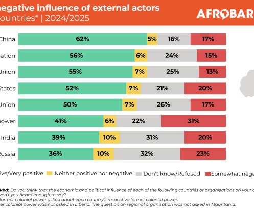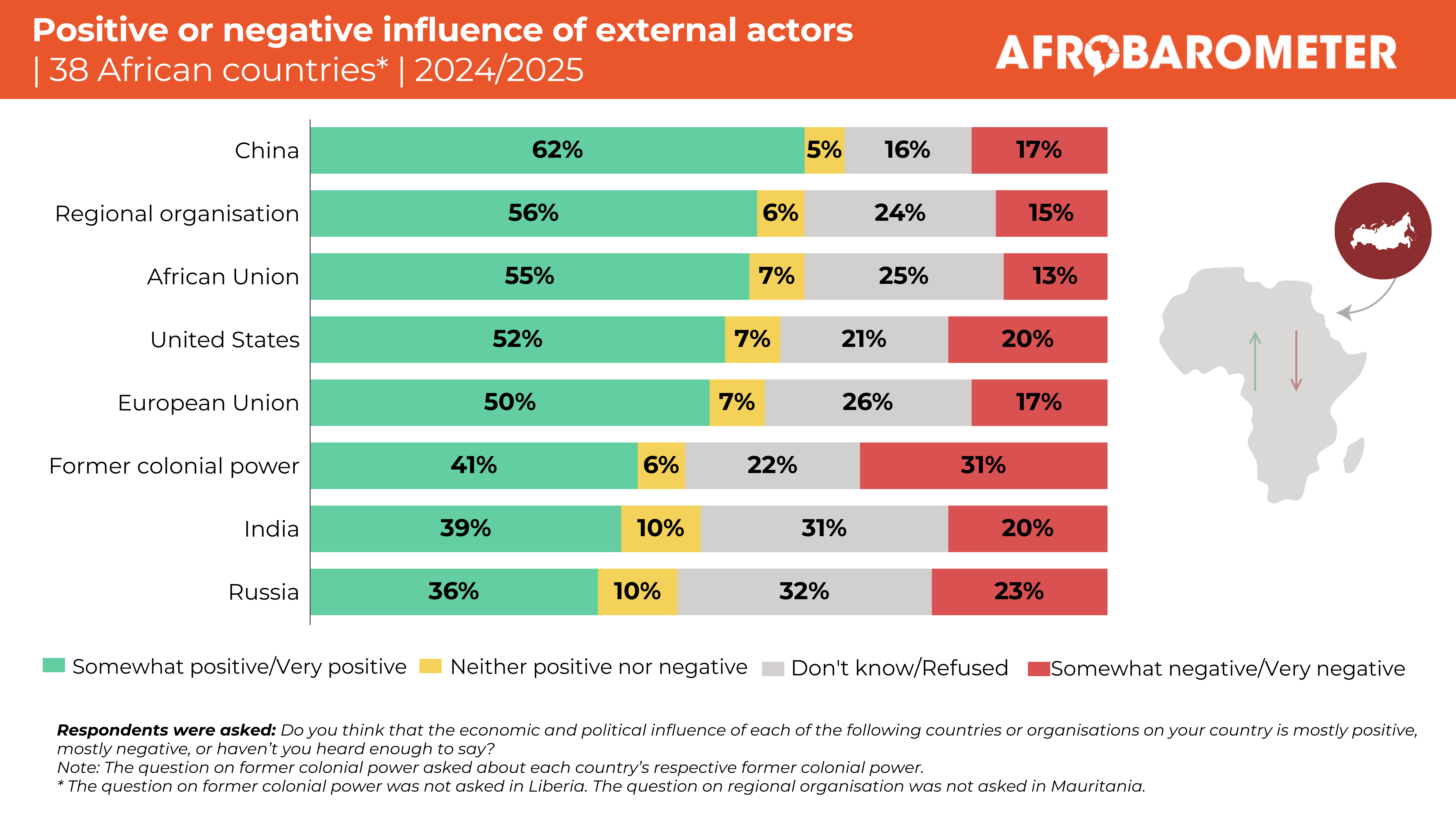 Fewer than four in 10 Africans see Russia’s economic and political influence on their country as positive, well below assessments for China, the United States, and international organisations, the latest Afrobarometer (www.Afrobarometer.org) survey findings reveal.