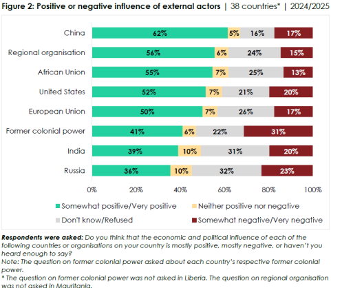 • Positive perceptions of Russia fall far below those for China (62%), regional economic organisations (56%), the African Union (55%), the United States (52%), and the European Union (50%) (Figure 2).
