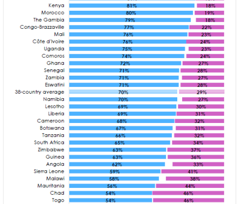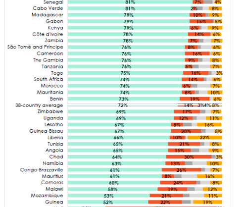 • By a wide margin, Malians offer the most positive assessments (88%), followed by Cameroon (60%), Guinea-Bissau (55%), and Côte d’Ivoire (55%). In contrast, fewer than one in six respondents hold positive views in four Southern African countries: Zambia (15%), Lesotho (14%), Eswatini (14%), and Botswana (13%).