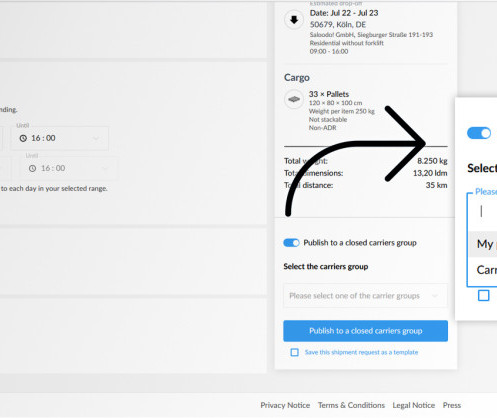Les expéditeurs souhaitant participer à la procédure de « Closed Shop » doivent d’abord contacter Saloodo!. Une fois que leur compte a été activé pour pouvoir utiliser « Closed Shop », ces expéditeurs peuvent saisir les détails de leur demande de transport sur la plateforme, comme d’habitude. Avant de publier leur demande de transport sur la plateforme de fret, ils peuvent choisir si la demande doit être présentée exclusivement aux transporteurs du « Closed Shop » spécifique. Dans ce cas, il suffit de cliquer sur un bouton et les transporteurs du « Closed Shop » seront informés de la nouvelle demande de transport. Ils peuvent ensuite soumettre leur offre pour l'ordre, ce qui leur convient également parfaitement : une véritable situation gagnant-gagnant pour les deux parties.