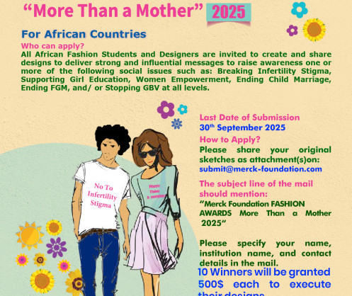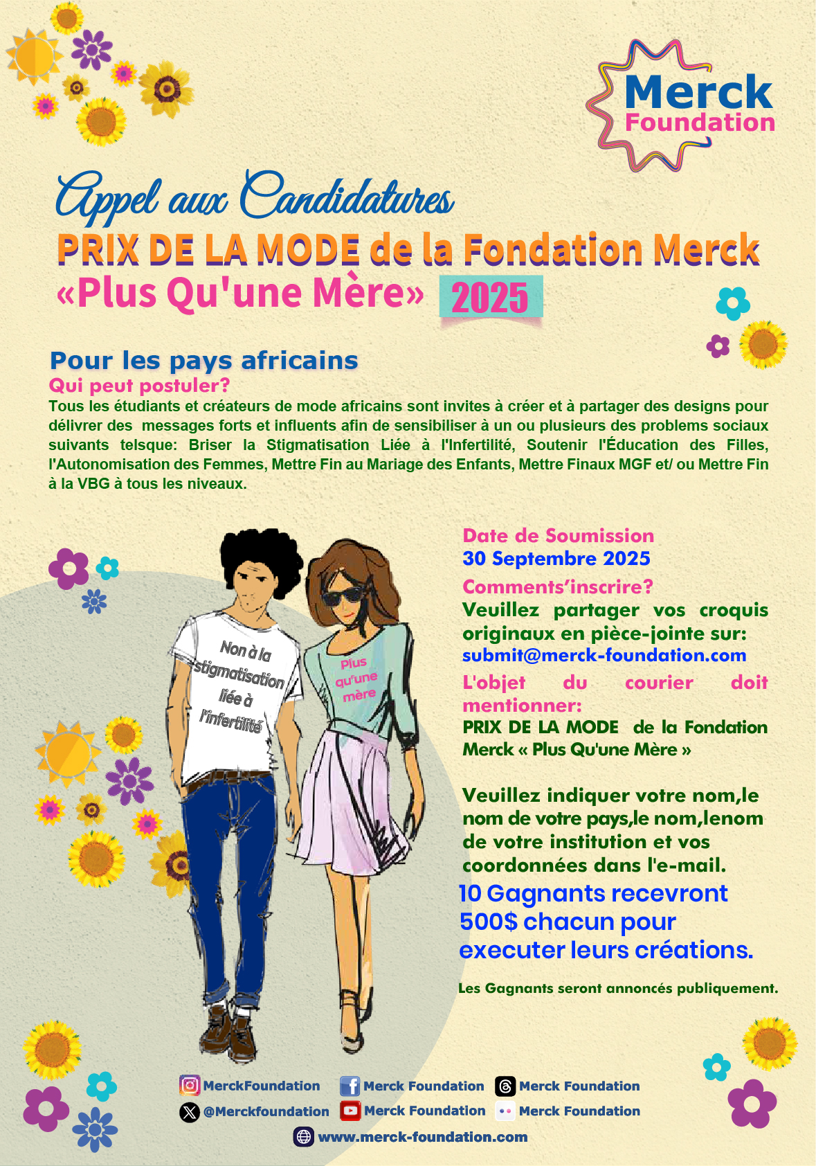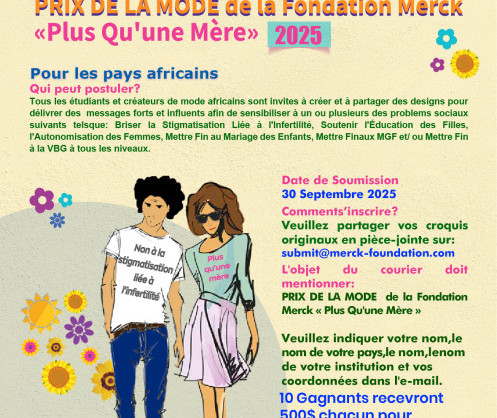 La Fondation Merck invite tous les créateurs de mode et étudiants africains à créer et à partager des modèles qui délivrent des messages forts et influents. 1) Prix de la MODE de la Fondation Merck « Plus Qu'une Mère » pour aborder un ou plusieurs des problèmes sociaux suivants, tels que : Briser la stigmatisation de l'infertilité, soutenir l'éducation des filles, mettre fin au mariage des enfants, mettre fin aux mutilations génitales féminines, arrêter la violence liée au genre et l'autonomisation des femmes, et 2) Prix de la MODE de la Fondation Merck « Diabètes et Hypertension » pour promouvoir un mode de vie sain et sensibiliser à la prévention du diabète et de l'hypertension et à la promotion d'un mode de vie sain en Afrique.
