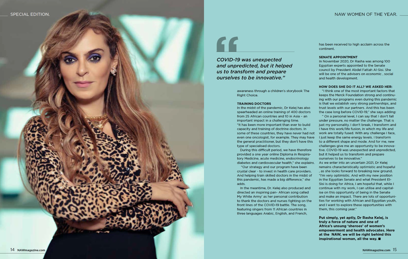 « Je suis honorée d'avoir été nommée Femme Africaine de l'année 2020 par New African Woman Magazine, Royaume-Uni, pour reconnaître mes efforts et mon dévouement à plaider en faveur de l'autonomisation des femmes et du renforcement des capacités de santé, en particulier en ces temps difficiles de la pandémie de coronavirus. Merci à qui a cru en moi. Je suis également très honoré d'avoir été nommé par le Président Égyptien, S.E. Abdel Fattah Al-Sisi, en tant que membre du Sénat Égyptien (2020-2025) pour aider à renforcer la collaboration et le partenariat entre l'Égypte et le reste de l'Afrique dans le but de continuer notre contribution au développement social, économique et sanitaire de notre beau continent. De plus, je continuerai ma mission d'autonomisation d'autres femmes et d'améliorer l'accès à des soins de santé équitables et de qualité en Afrique et dans les pays en voie de développement. C'est mon engagement personnel », a déclaré la sénatrice Dr. Rasha Kelej CEO Merck Foundation, membre du Sénat égyptien (2020-2025), Africaine la Plus Influente (2019 et 2020) et Femme Africaine de l'année 2020.
