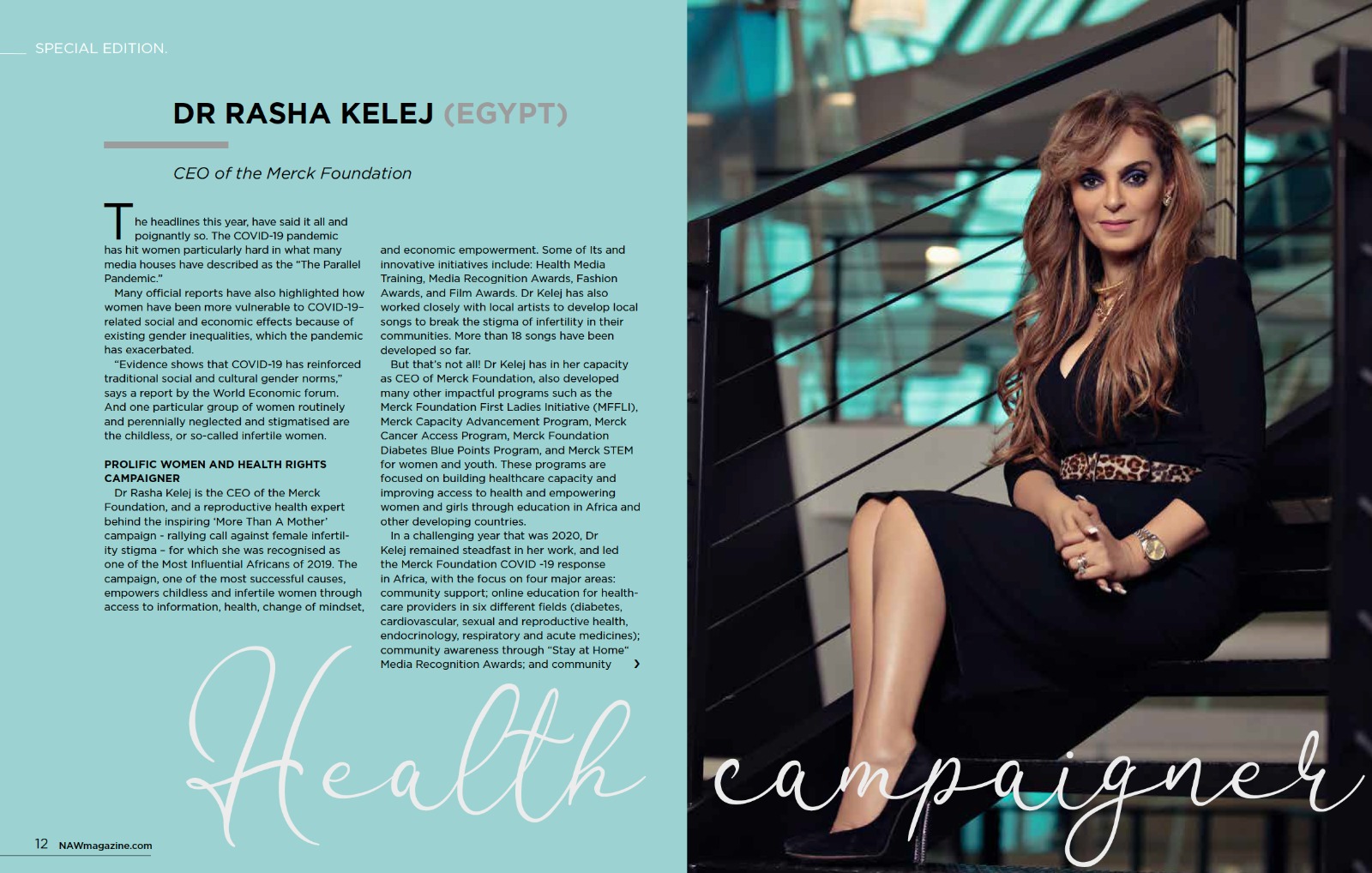 La Sénatrice Dr Rasha Kelej, CEO Merck Foundation et membre du Sénat Égyptien (2020-2025) a été nommée pour la troisième fois l'une des Femmes Africaines les Plus Influentes au monde pour 2020. Elle a été nominée cette année comme la « Femme Africaine de l'année 2020 » par le New African Woman Magazine UK, et la Femme Africaine la Plus Influente 2020, par Avance Media, pour ses efforts de plaidoyer pour l'autonomisation des femmes et le renforcement des capacités de soins de santé, en particulier pendant ces les temps difficiles de la pandémie de coronavirus. La sénatrice Dr. Kelej a déjà été reconnu comme l'Un des 100 Africains les Plus Influents - 2019 par New African Magazine au Royaume-Uni pour avoir créé la campagne historique « More Than A Mother » pour briser la stigmatisation autour des femmes infertiles et sans enfants en Afrique et ailleurs.