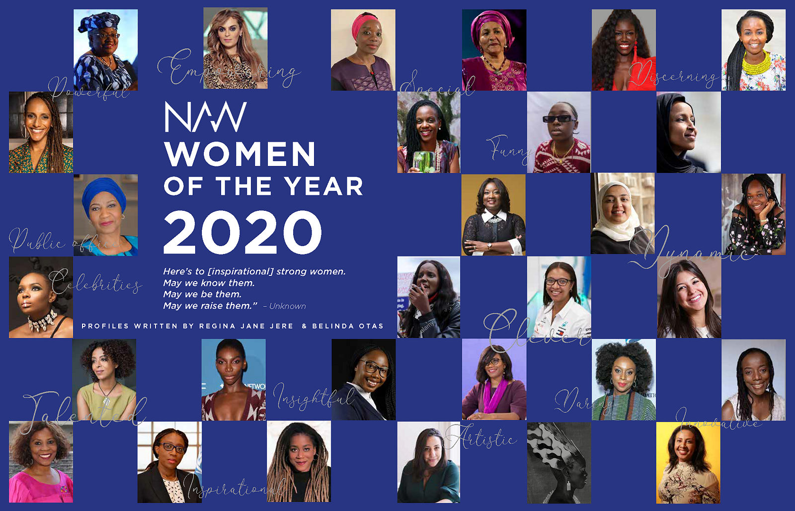 La New African Woman (NAW) a répertorié 30 femmes africaines fortes comme femmes de l'année 2020, choisies dans divers horizons de carrière. La liste comprend de nombreux noms célèbres comme : Amina J. Mohamed : Vice-Secrétaire Générale aux Nations Unies ; Fadji Maina : Scientifique de la Terre à la NASA ; Bozoma Saint John : Chef du Marketing Mondial de Netflix ; Michaela Coel : Productrice, Actrice, Réalisatrice ; Matshidiso Moeti, Directeur Régional de l'OMS pour l'Afrique, entre autres.