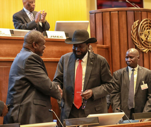 • En septembre 2018, les belligérants au Soudan du Sud, le Président Salva Kiir (à droite) et son rival, Riek Machar, avaient signé un accord de paix (Photo MINUSS / Nektarios Markogiannis)