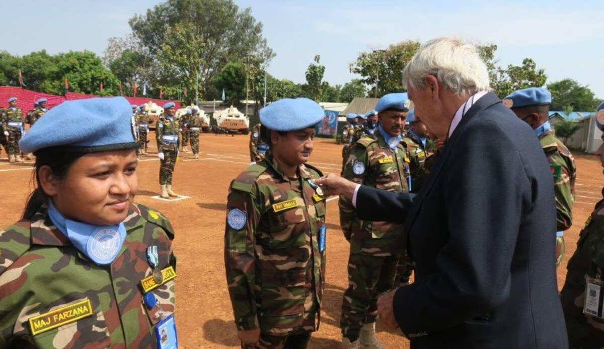 • On his recent visit to Wau, Nicholas Haysom, Special Representative of the Secretary-General and Head of UNMISS, visited a training site for South Sudanese military personnel, discussed key issues with state authorities and awarded medals to 848 peacekeepers from Bangladesh. Photo by Dawit K.Tedla/UNMISS.