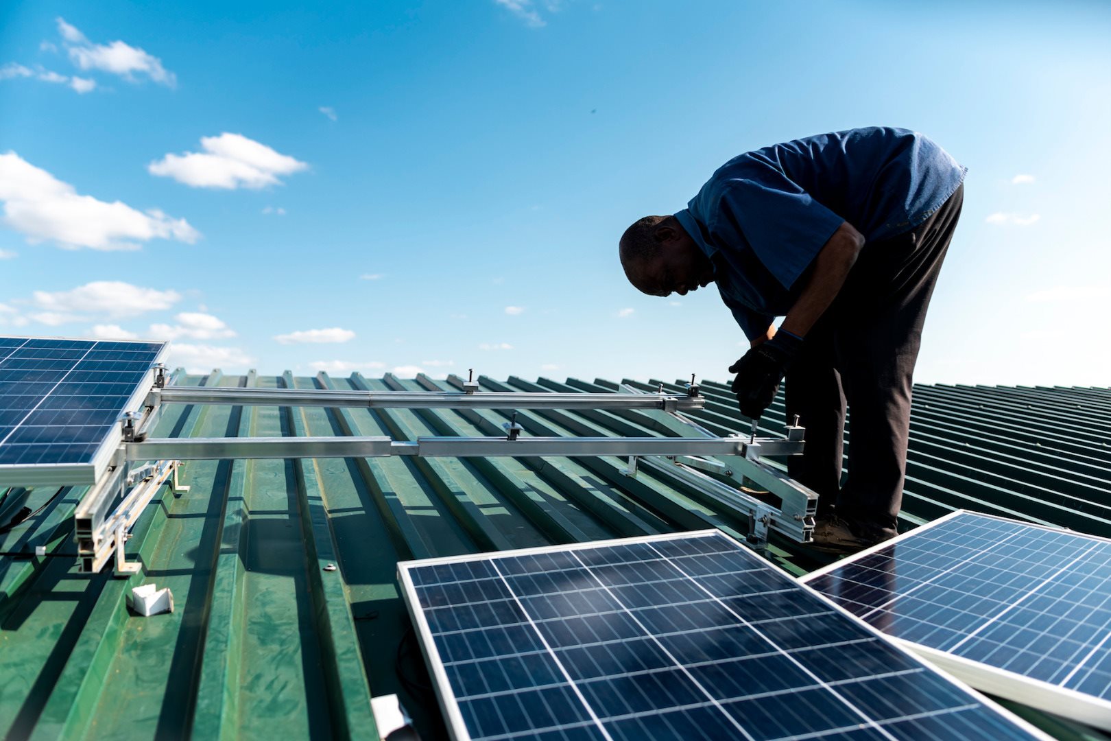 • Worker install solar panels in the brand new health center funded by Sweden in Funhalouro District, Inhambane Province, Mozambique Credit: UNCDF/Milton Zango