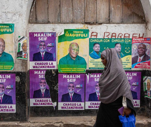 • A woman walks past a wall with posters of presidential candidates in Zanzibar’s town on October 24, 2020. Credit: Patrick Meinhardt / AFP via Getty Images