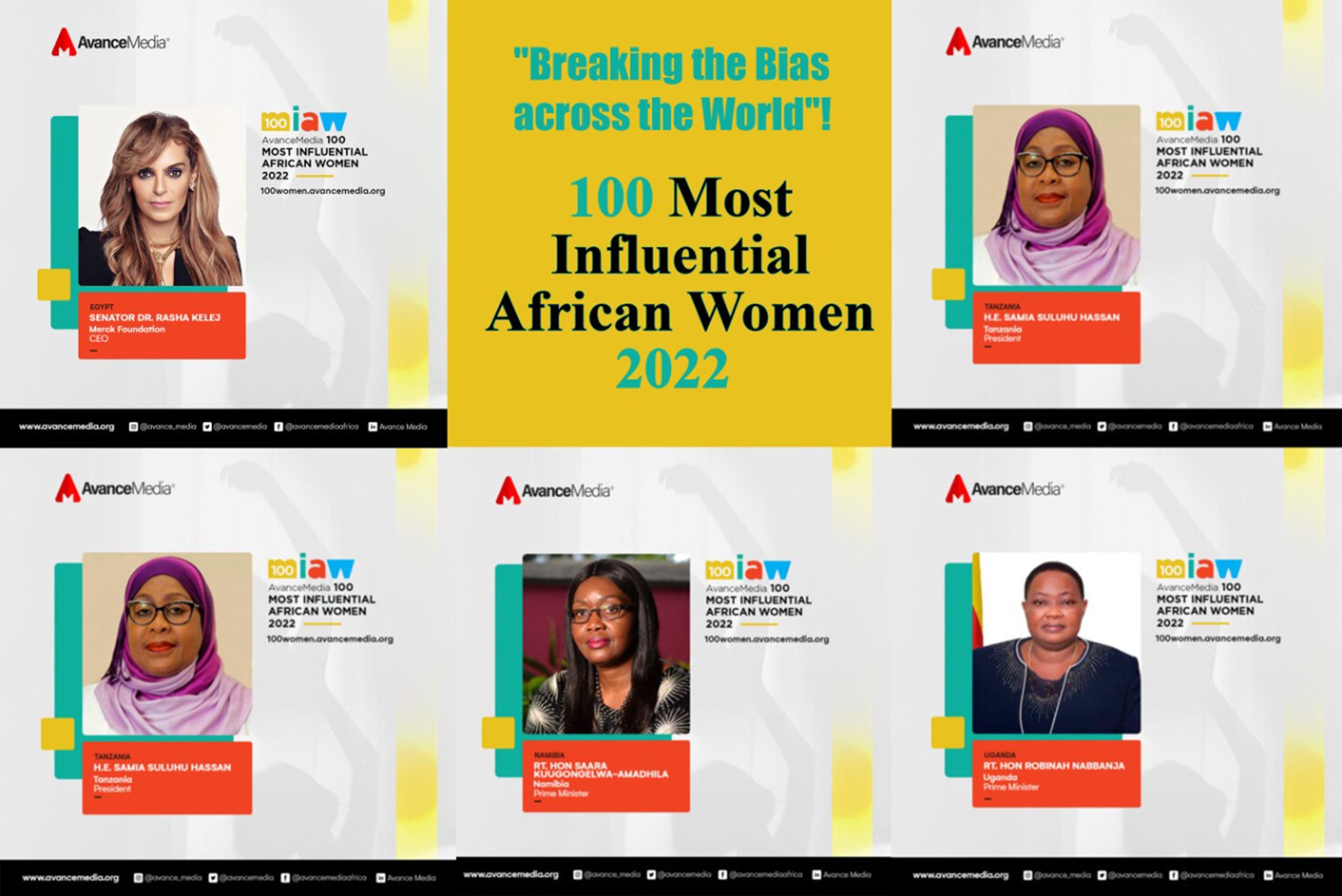 A lista das 100 Mulheres Africanas Mais Influentes de 2022 tem uma representação das mulheres africanas mais poderosas de 36 países africanos, escolhidas entre várias carreiras, incluindo diplomacia, filantropia, política, activismo, empreendedorismo, liderança empresarial e entretenimento. Inclui muitos nomes famosos como; S. Exª SAMIA SULUHU HASSAN, Presidente da Tanzania; Rt. Hon Robinah Nabbanja, a Primeira Ministra do Uganda; Rt. Hon Saara Kuugongelwa-Amadhila, a Primeira Ministra da Namíbia e Rt. Hon Victoire Tomegah Dogbé, o Primeiro Ministro do TOGO, entre outras.