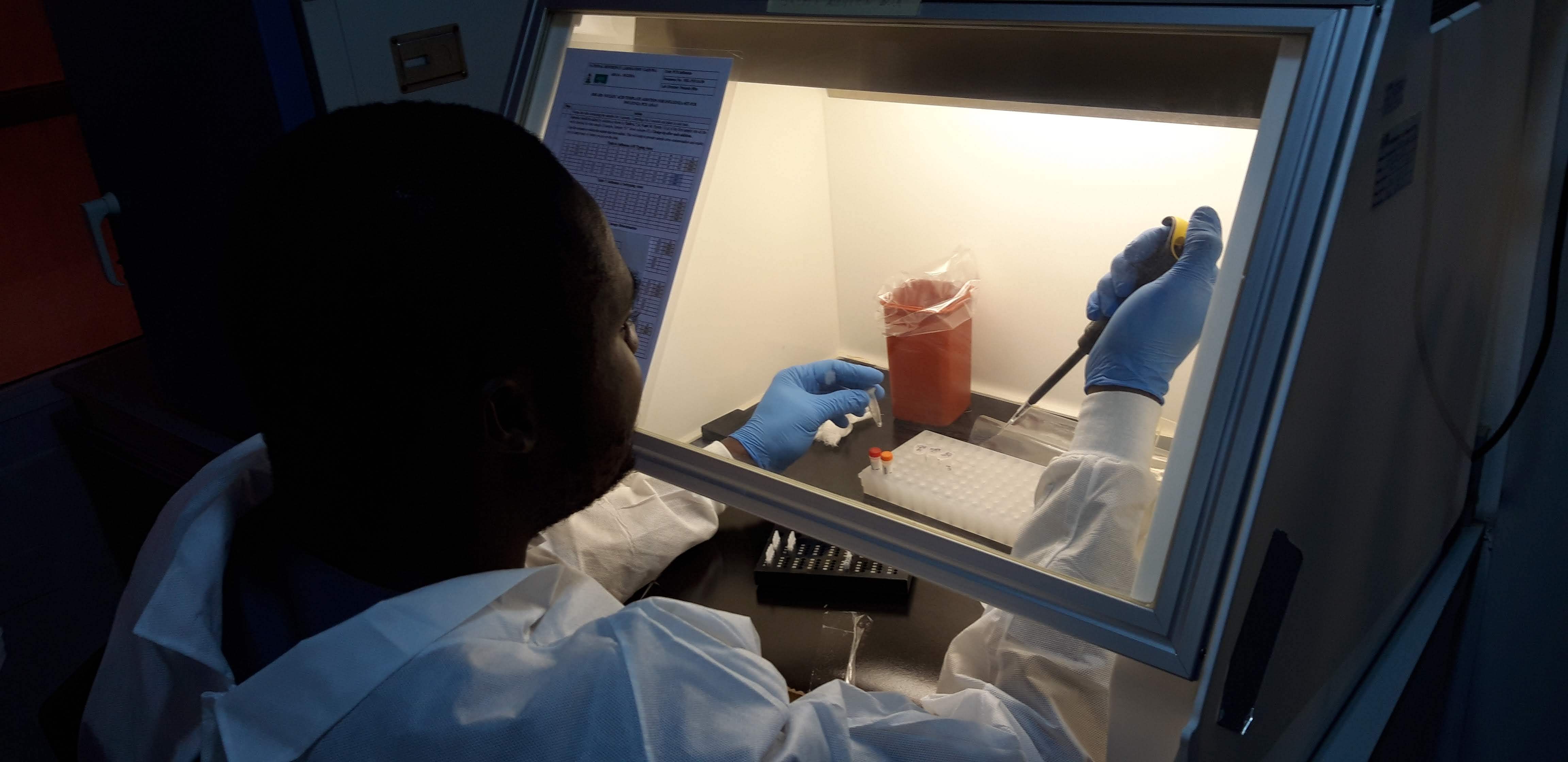 • A laboratory technician prepares samples for Lassa fever testing in the National Reference Laboratory of the Nigerian Centre for Disease Control. (c) FIND / Devy Emperador, 2019