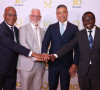 • Poignée de main lors des 10 ans d'impact de Mitrelli : (De gauche à droite) Dr. Vaflahi Meite, Directeur général de la diplomatie économique, Ministère des affaires étrangères, de l'intégration régionale et de la diaspora, République de Côte d'Ivoire ; Haim Taib, fondateur et président du groupe Mitrelli et de la Fondation Menomadin ; João Baptista Borges, ministre de l'eau et de l'énergie de l'Angola ; Dr Serigne Gueye Diop, Ministre et Conseiller du Président du Sénégal pour l'Agriculture et l'Industrie. Source des image : Micha Brikman