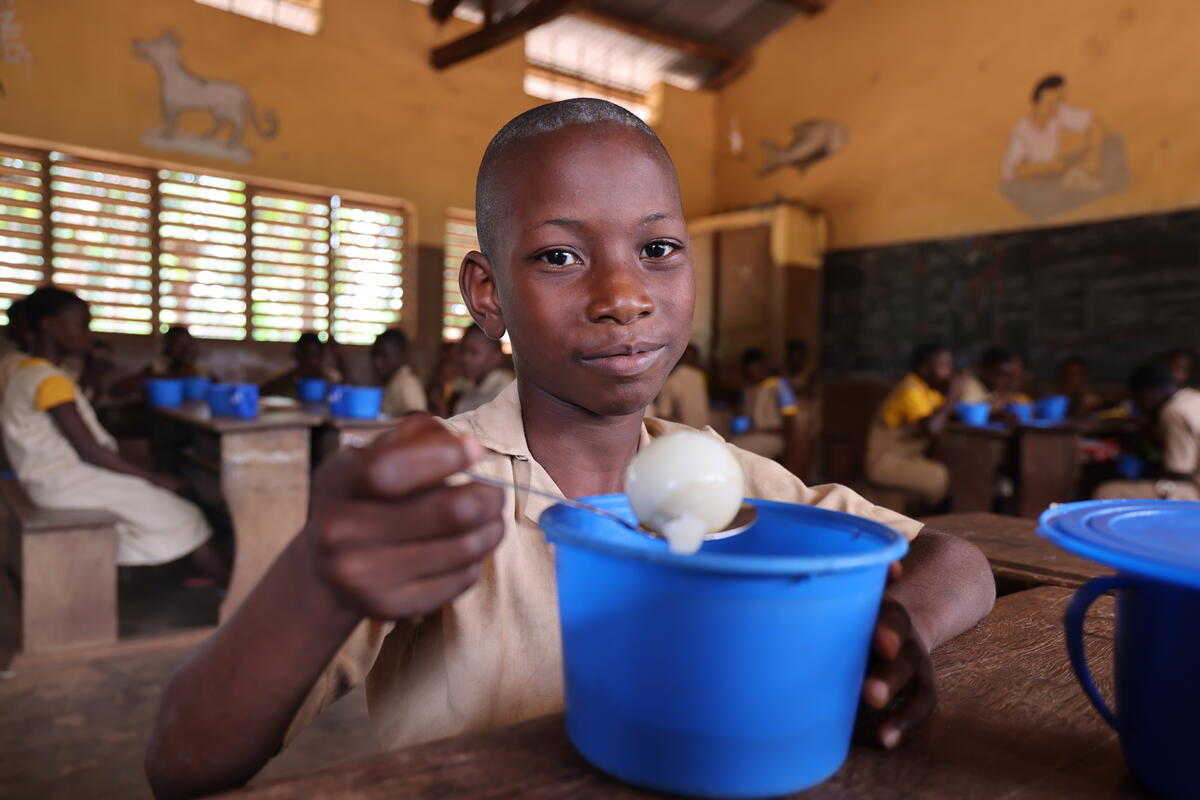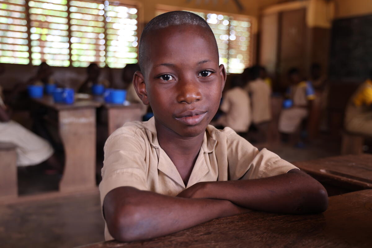 • Privat, 9 years old, is a student at the Honhoun public primary school in Djidja. He receives nutritious meals at school thanks to the Integrated School Feeding and Nutrition Project that WFP is implementing. Life-changing interventions like these are enabled through the support of valued donors—including the Choithram International Foundation—who remain key partners in WFP’s humanitarian efforts. Photo: © WFP/Bismarck Sossa (2)
