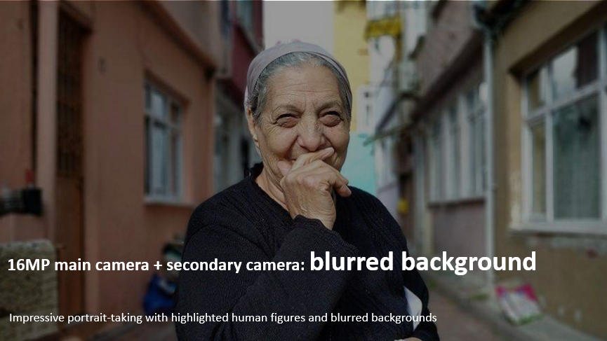 Enfin, la combinaison de l'appareil photo principal, avec ses 16 mégapixels, et de l'appareil photo secondaire offrent un effet Bokeh, qui insiste sur le sujet principal de la photographie et floute de mille et une lumières l’arrière-plan, donnant aux portraits le sens visuel le plus pertinent et apportant une prise de vue impressionnante avec des figures humaines et des arrières plans flous mis en évidence.
