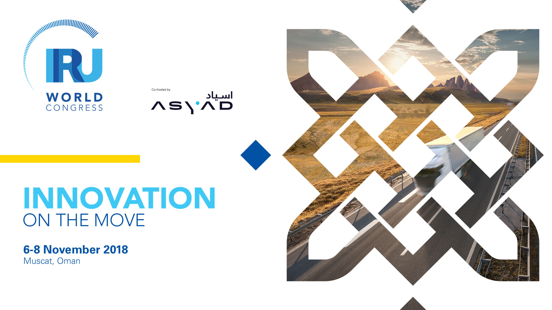 The IRU World Congress is the platform for global decision-makers to exchange ideas, debate solutions and define the future of the road transport industry. Centred on the themes of innovation and trade, Innovation on the Move will take place at the new Oman Convention and Exhibition Centre in Muscat, from 6 to 8 November 2018. www.IRUWorldCongress.com/