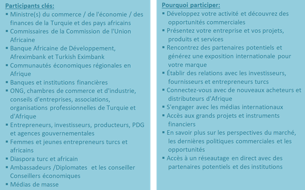 La réunion, coprésidée par S.E. Ruhsar PEKCAN, ministre du commerce de la République de Turquie et S.E. Victor HARISON, commissaire aux affaires économiques de la Commission de l'Union africaine (CUA), se tiendra avec la participation des ministres du commerce et de l'industrie de Cameroun, République démocratique du Congo, Djibouti, Gabon, Mauritanie, Namibie, Niger, Nigeria, Rwanda, Sierra Leone, Somalie et Zimbabwe, ainsi que les secrétaires généraux de la Communauté de l'Afrique de l'Est (CAE) et du Marché commun de l'Afrique orientale et australe (COMESA).