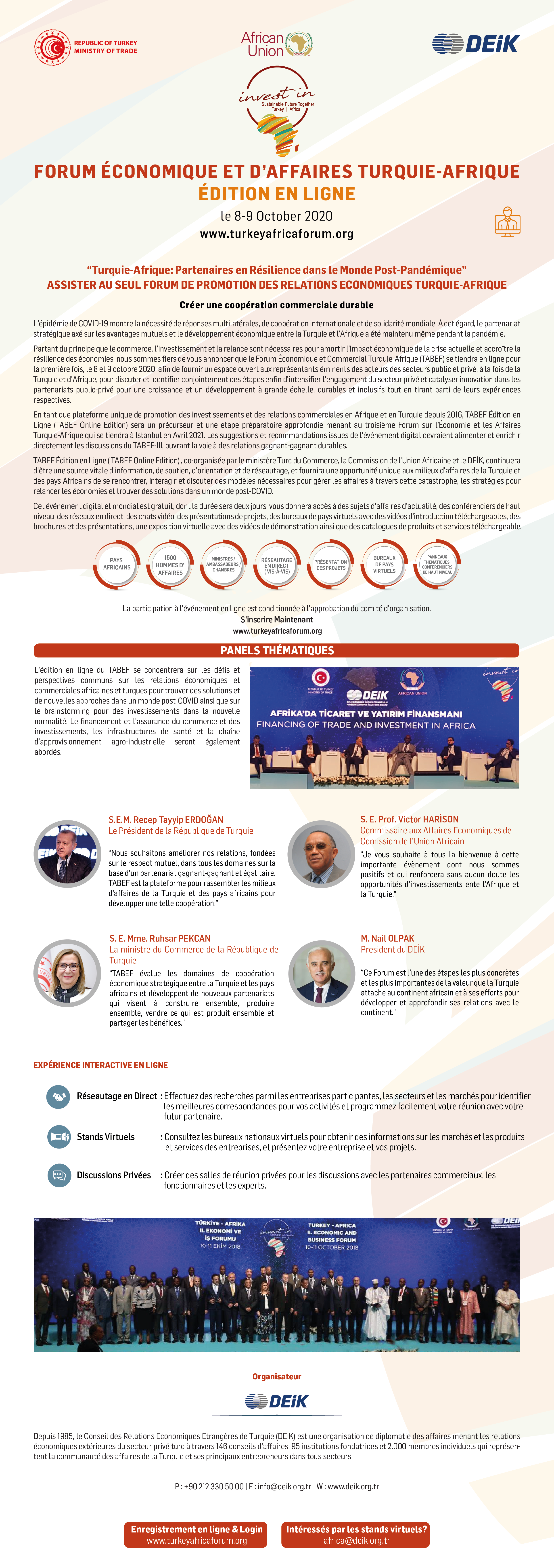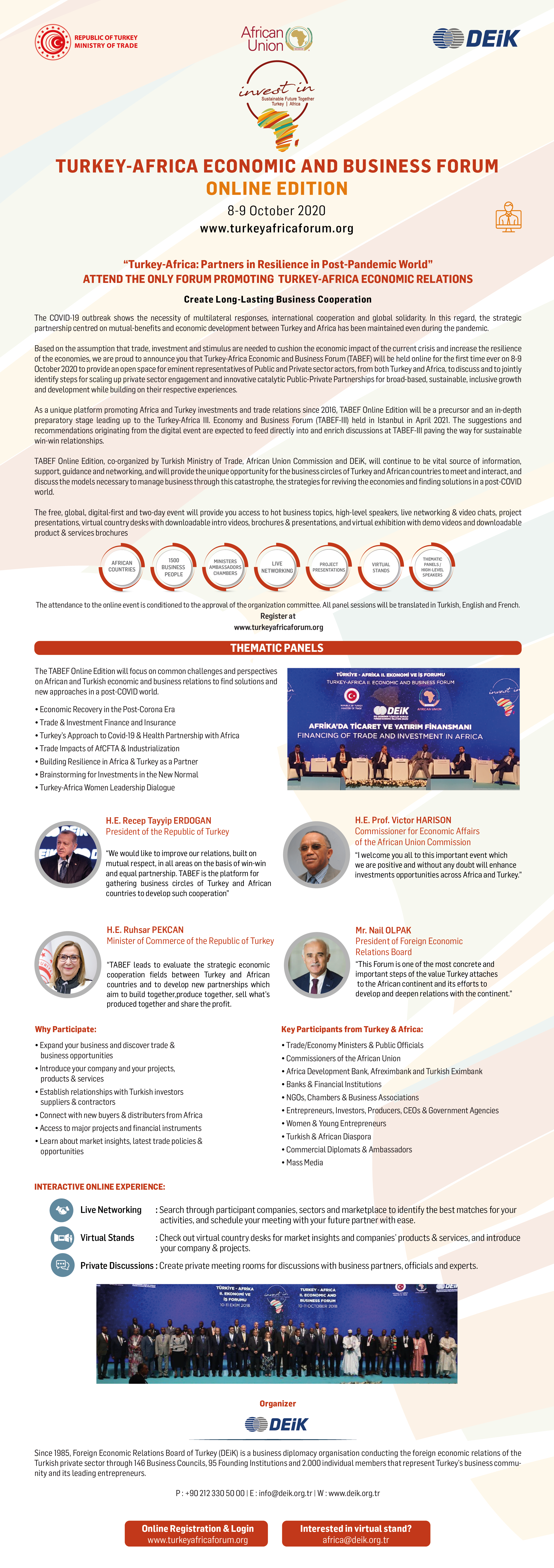 TABEF Édition en Ligne (TABEF Online Edition), Co-organisée par le Ministère Turc du Commerce, la Commission de l'Union Africaine (AUC) et le Conseil des Relations Economiques Enrangéres de la Turquie (DEiK), continuera d'être une source vitale d'information, de soutien, d'orientation et de réseautage, et fournira une opportunité unique aux milieux d'affaires de la Turquie et des pays Africains de se rencontrer, (1.500 Hommes d’Affaires) interagir et discuter des modèles nécessaires pour gérer les affaires à travers cette catastrophe, les stratégies pour relancer les économies et trouver des solutions dans un monde post-COVID.