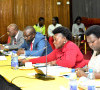 • Hon. Sarah Opendi (2nd, R) and colleagues who sit on PAC interacting with hospital officials over audit queries