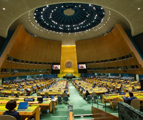 • UN member countries address the 76th session of the United Nations General Assembly at UN headquarters in New York City, September 25, 2021. © 2021 Kena Betancur/Pool Photo via AP
