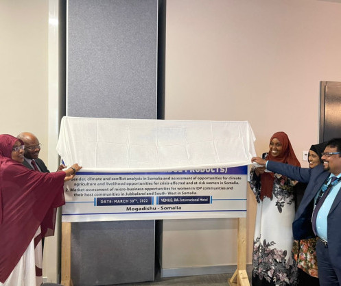 UN Women Somalia, in partnership with the Federal Ministry of Women and Human Rights Development (MoWHRD) and Ministries of Women, Jubaland and South West State launched two research studies focused on gender, climate and conflict analysis, and market assessments of micro-business opportunities at a high level event in Mogadishu on 30 March, 2022: “Gender, climate and conflict analysis in Somalia and assessment of opportunities for climate agriculture and livelihood opportunities for crisis-affected and at risk women in Somalia” and “Market assessment of microbusiness opportunities for women in IDP communities and their host communities in Jubaland and South West Somalia”.