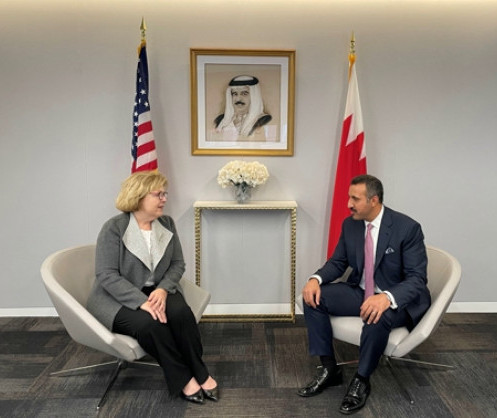The Undersecretary of the Ministry of Foreign Affairs for Political Affairs, HE Dr. Shaikh Abdullah bin Ahmed Al Khalifa, met at the Embassy of the Kingdom of Bahrain in Washington, with the Director of Middle East and North African Affairs at the US National Security Council, HE Ambassador Barbara Leaf, and a candidate for the position of Assistant Secretary of State for Near Eastern Affairs.