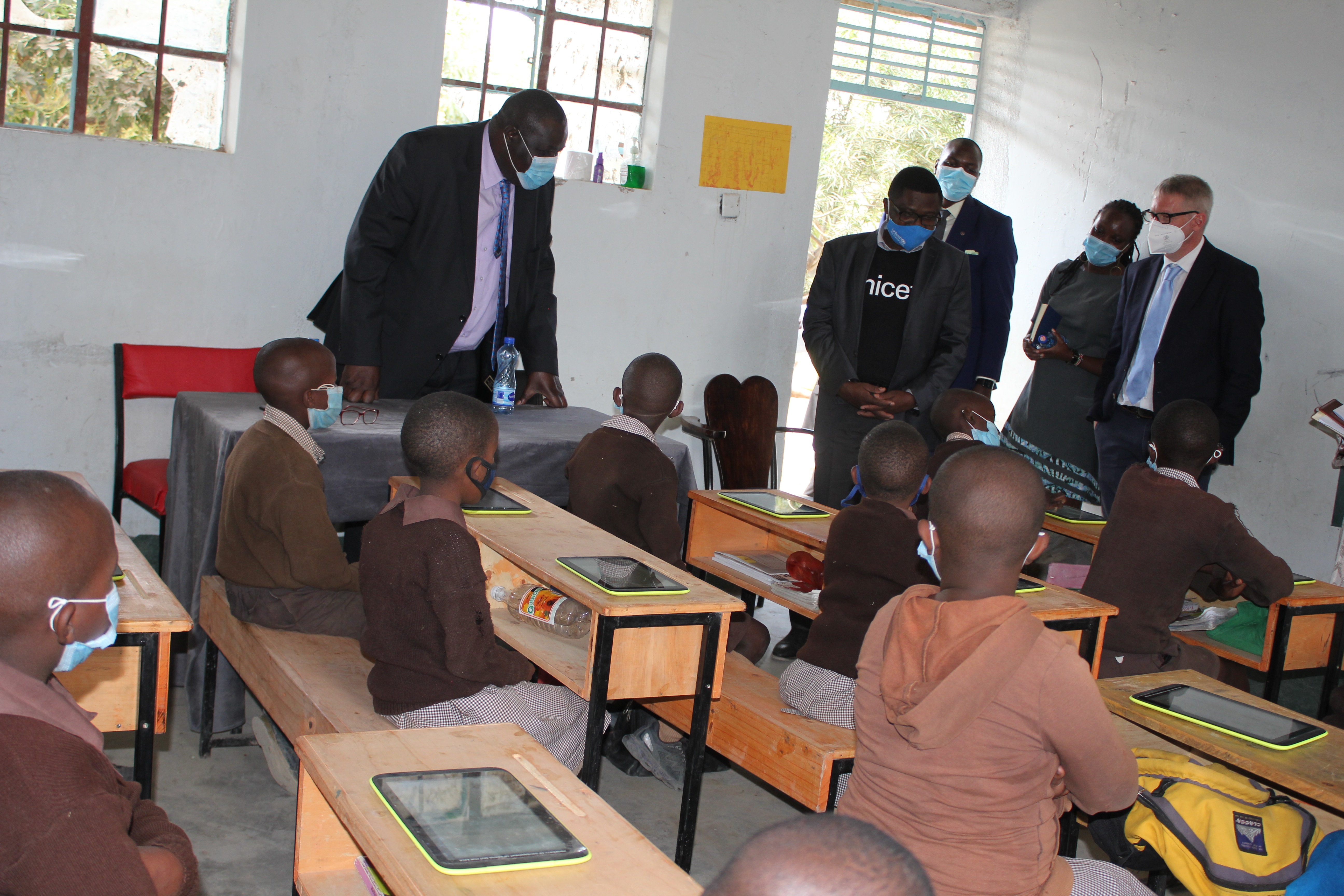 • Students at Noonkopir Primary explore the wonders of the digital world as Dr. Julius Jwan, PS for Basic Education Kenya and executives from Liquid and UNICEF