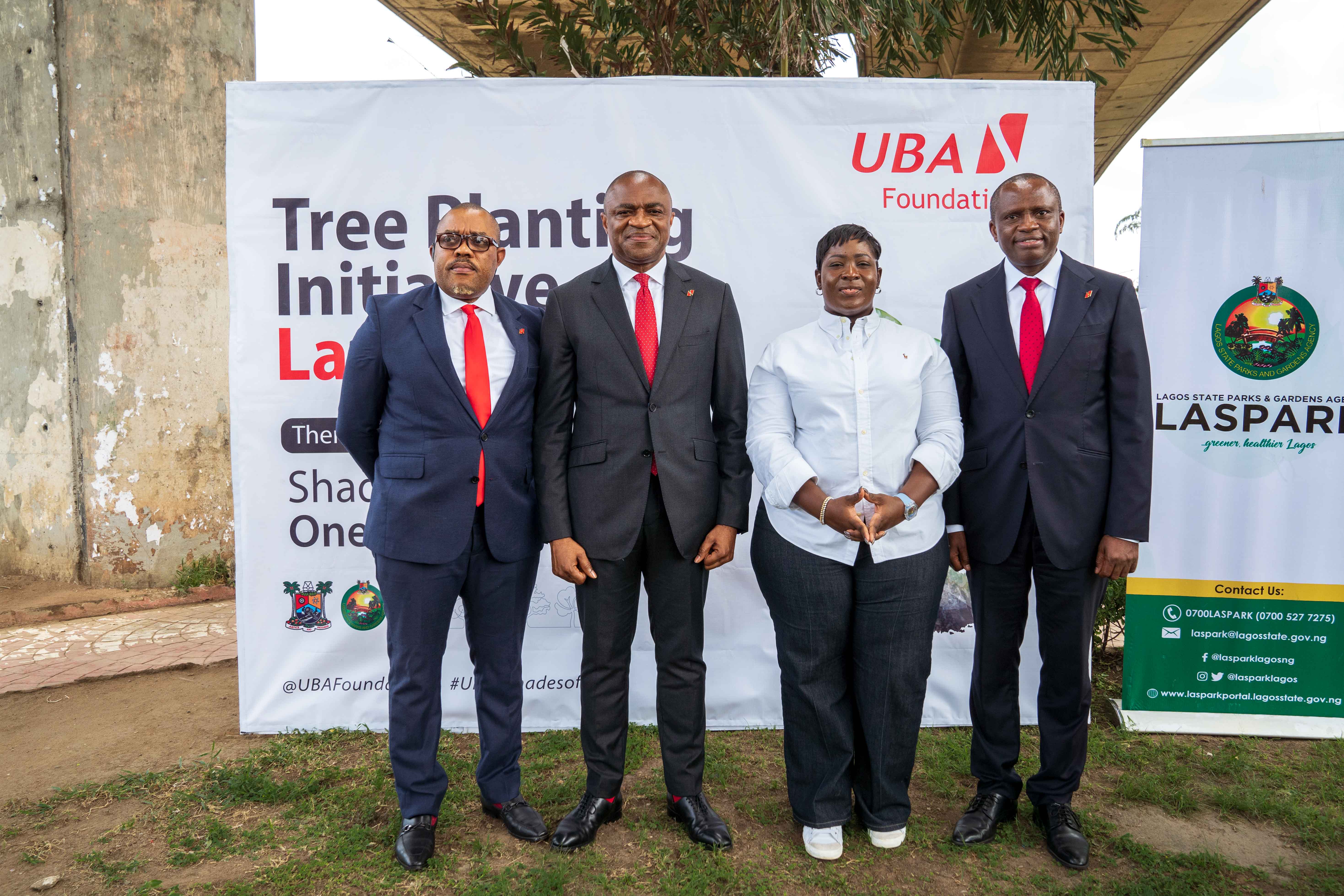 • L-R: Executive Director/GCOO, United Bank for Africa(UBA), Mr. Alex Alozie; Group Managing Director/CEO, UBA, Mr. Oliver Alawuba; General Manager, Lagos State Parks and Gardens, Adetoun Popoola; and Executive Director, Finance and Risk Management, Ugo Nwaghodoh, at the flag-off of UBA Foundation’s Tree Planting Initiative, held at the UBA Foundation Garden in Marina, Lagos on Thursday