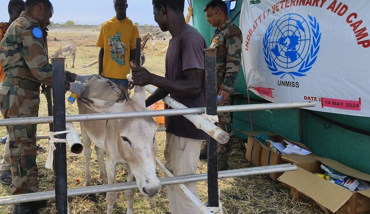 United Nations Mission in South Sudan (UNMISS) peacekeepers from India provide free veterinary services in Kodok